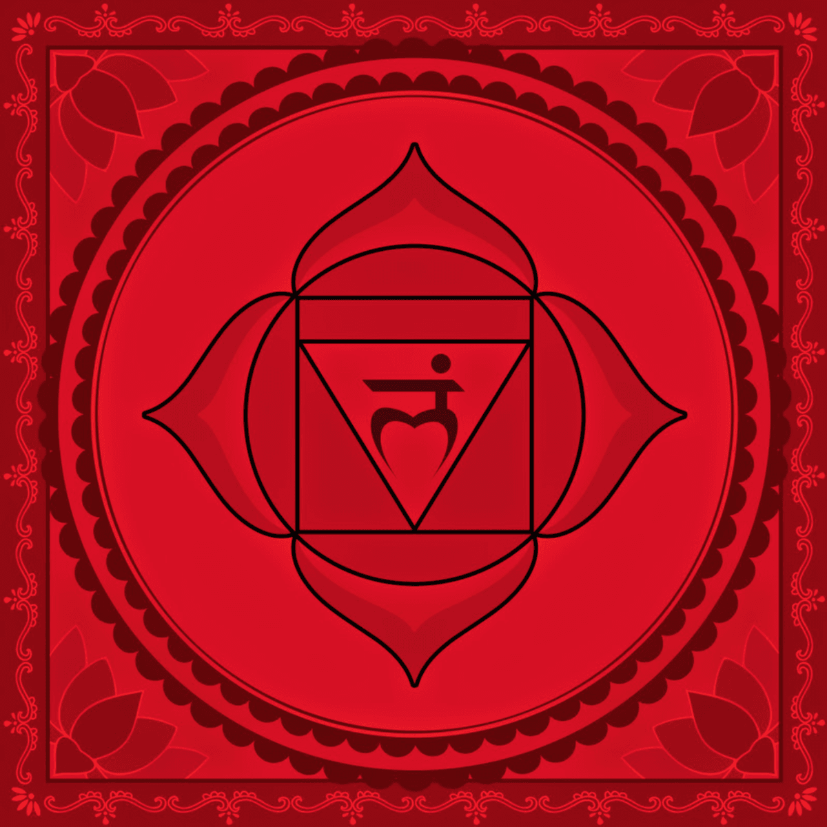The root chakra, respectively known by its Sanskrit name, Muladhara, meaning root support, is the first chakra out of seven, an individual will need to open before embarking on a journey toward enlightenment or seeking alternative healing. It is located at the base of the spine near the coccygeal plexus. It is associated with the color red, due to their unanimous symbol of beginnings. The chakra itself portrays a four petaled lotus surrounding a square. The square represents the physical world and the four petals represent the four elements of the physical world: Earth, Fire, Water and Air. It is accompanied by a downward triangle, which represents the downward pull of the chakra. Generally, it serves as a support system for grounding an individual in the physical world before entering the spiritual realm.