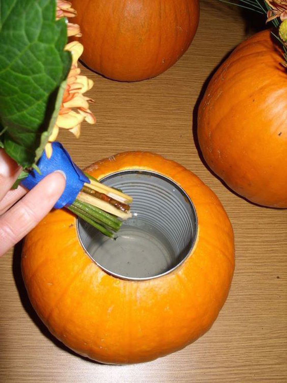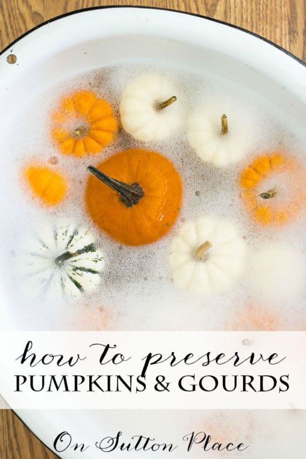 If you are going to use pumpkins as decoration or to put flowers in for a longer period of time try this trick to keep them from rotting right on your table. A good way for your pumpkins to last longer even after they are cut open is washing them in water and bleach which preserves them. One gallon of water, two tablespoons of bleach and a splash of dish soap.