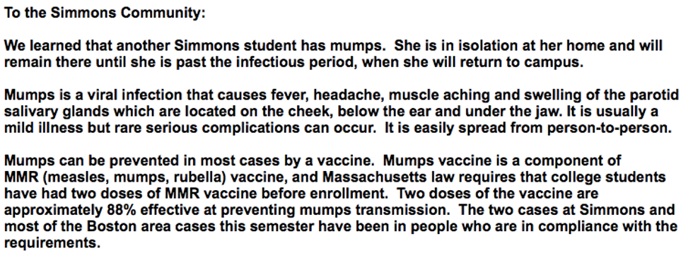 A few things to note: first, that Mumps is preventable by a vaccine: a 2-dose injection that is 88 percent effective. Second, Mumps is a very serious illness that can lead to severe complications. Finally, that both Simmons students who have Mumps were vaccinated. You may have never known a single person who has Mumps. Or, for that matter, Whooping Cough, Measles, Diptheria, smallpox, tetanus, polio, hepatitis A or B, rotavirus, rabies, typhoid fever, yellow fever, tuberculosis, or even Chicken Pox. Here's why: vaccines. Here's not why: it's not because these diseases no longer exist. It's because the vast majority of people in developed countries are vaccinated against these diseases. These diseases, which once killed thousands upon thousands of children in a single year, were once nearing extinction in developed countries -- which, by the way, means that there are no recorded cases, not that there are no pathogens left. And that, right there, is the crux of the problem.
