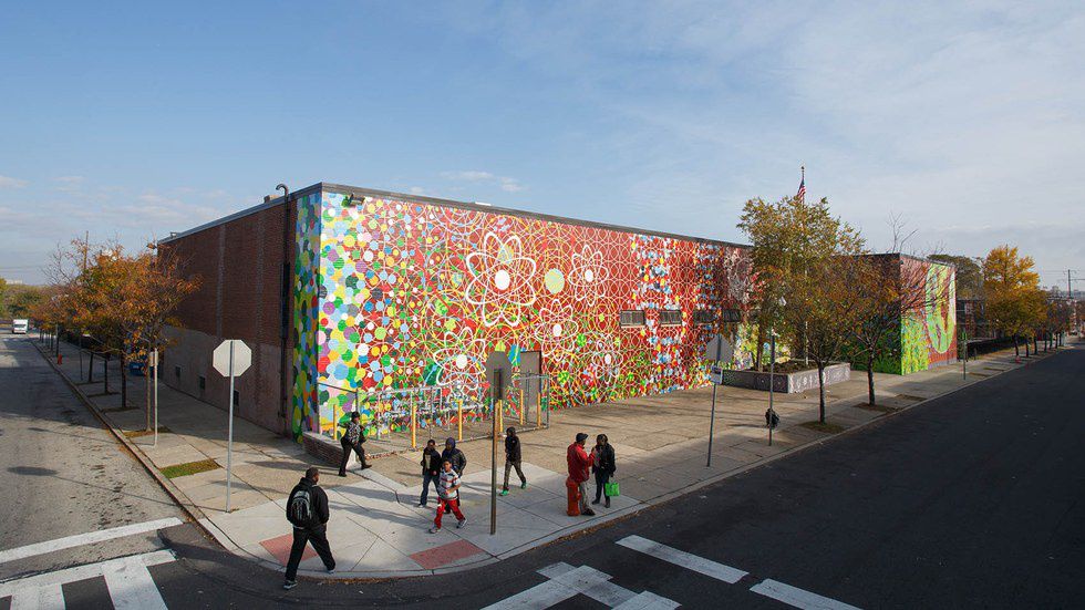 This mural has bursts of colors. The project was a partnership between Mural Arts and the Morton McMichael Elementary School.