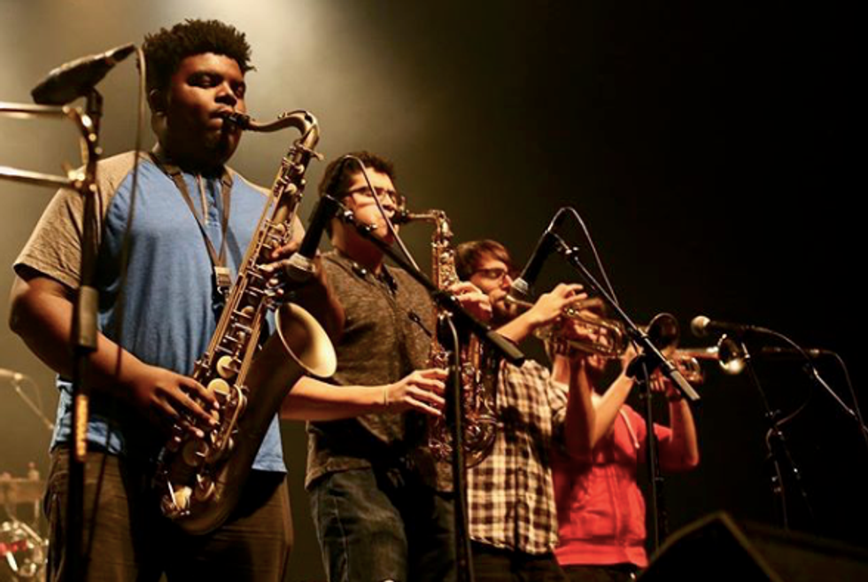 A group of guys from the UGA Redcoat band bringing funky horns to modern music