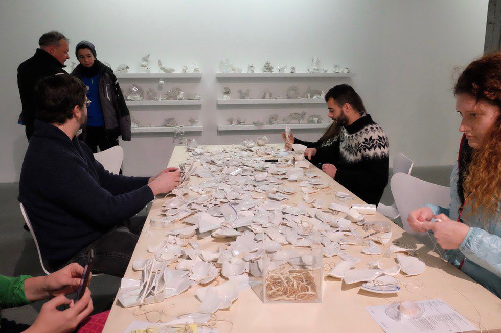I splattered paint, hammered nails onto a wooden canvas, walked around in a body bag, shook hands with someone through a hole, but my favorite was a table laid out with pieces of broken porcelain - plates, saucers, teacups - with rubber bands, tape, and string at your disposal to create something new out of these broken fragments.