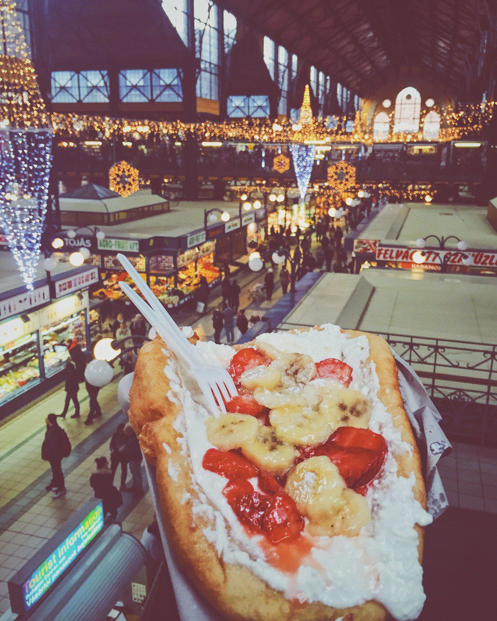 Thus far I have never spilled a food so much as this. This beauty is called a Langos. It can be found in Budapest Hungary ( here seen in the Great Market Hall) and it is a build your own type of food. The Langos is the fried bread underneath and the toppings are up to your hearts greatest desire.
