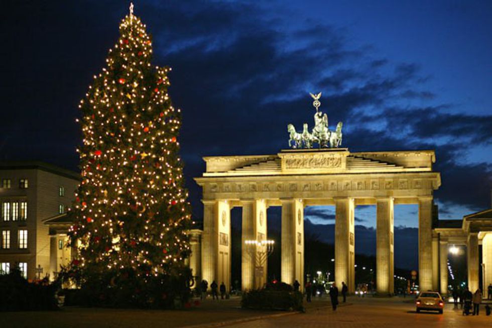 This Beautiful, Traditional Christmas tree is found to light up Berlin as it stands illuminated next to the Brandenburger Tor Brandenburg gate in Germany.