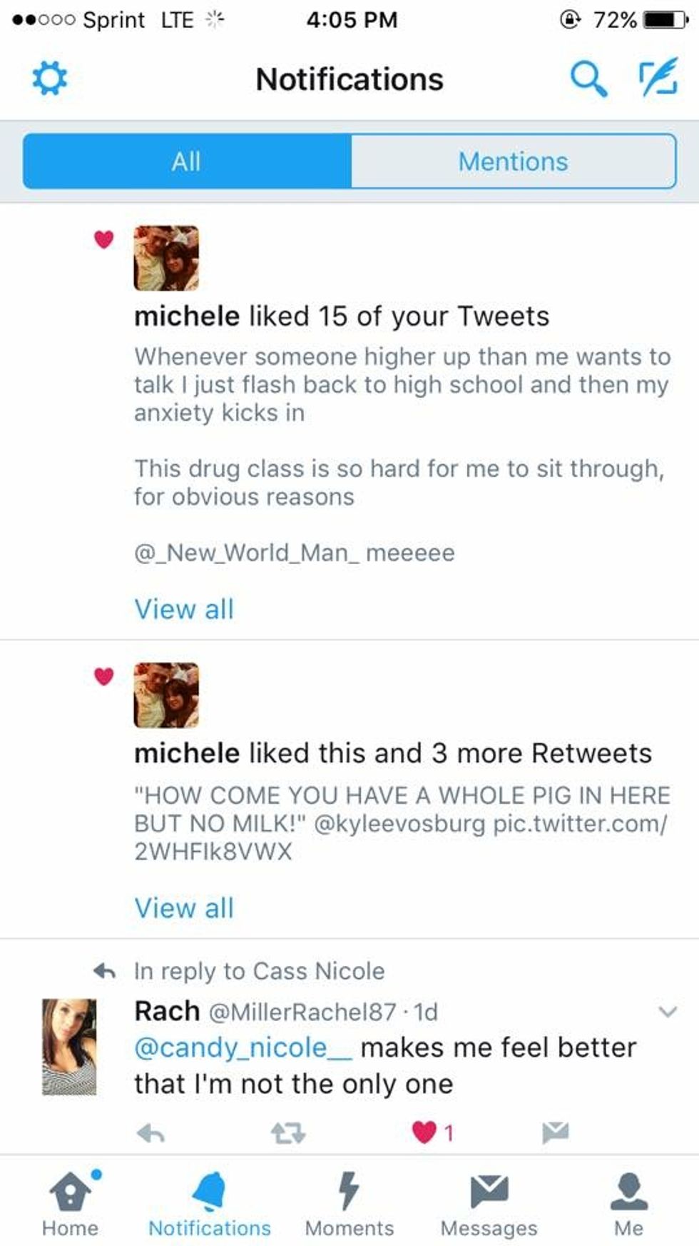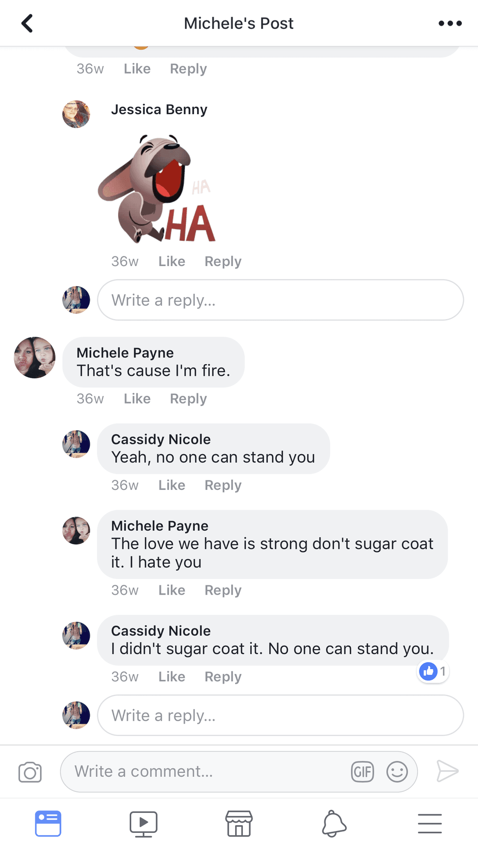 We wage war over text, snap chat and facebook. She seriously won't quit bothering me sometimes. One time she liked all of my tweets... and of course I had to facebook it after it happened.