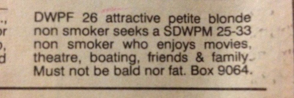 This is a picture of the actual ad in the actual newspaper that my mom submitted. She was a DWPF (divorced white professional female) who was 26. She also described herself as an attractive petite blonde who didn't smoke and was seeking a SDWPM (single divorced white professional male) who was between the ages of 25-33. He also had to be a non-smoker who enjoys movies, theatre, boating, friends & family and finally he must not be bald nor fat. Well despite my dad being 34 and a smoker he answered her ad because hey at least he wasn't bald nor fat.