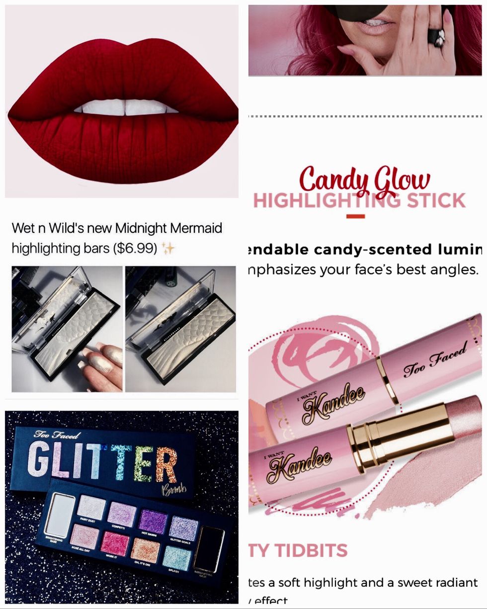 Wet 'n' Wild's "Mermaid Highlight," Too Faced's new glitter palette, a beautiful red lipstick from Lime Crime, and a pink highlight by Too Faced as well!