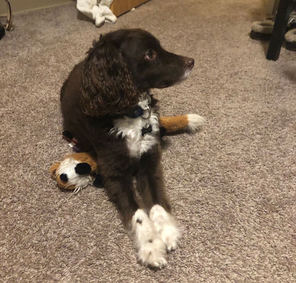Coco will leave her toys everywhere! Sometimes she destroys her toys and leaves the stuffing all over the place. Note: There are actually 2 toys under her in the pic.