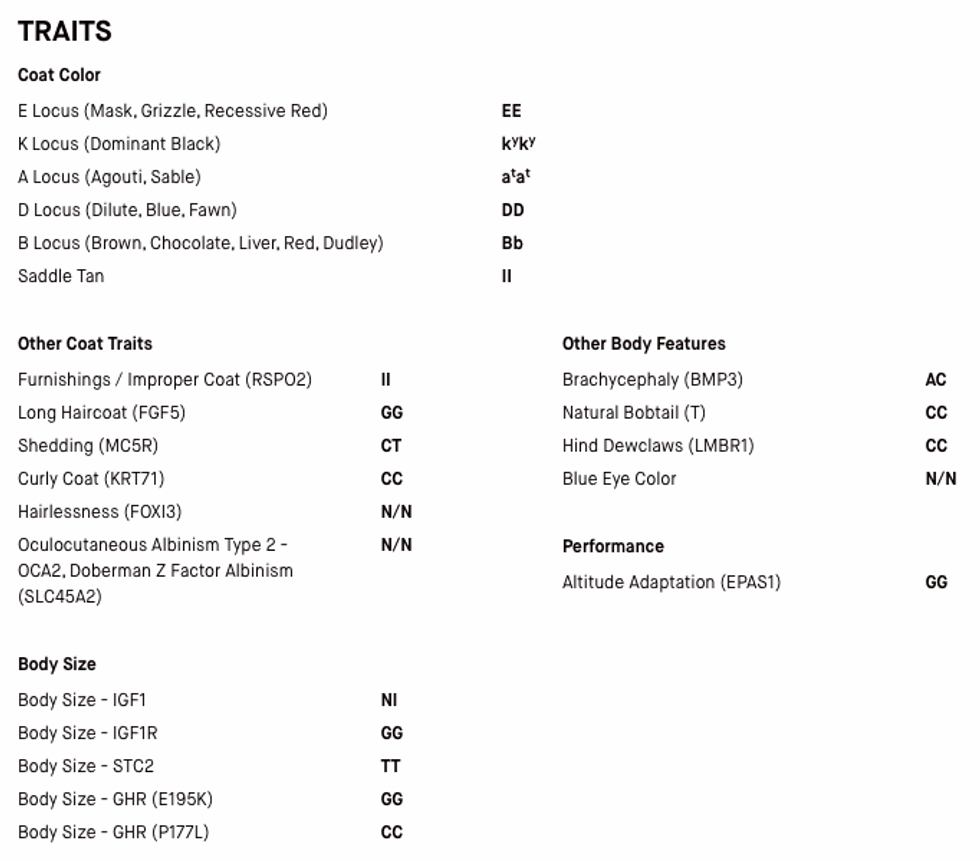 This section of the DNA results were super precise. It showed the exact gene Harley has that makes up all of his traits, including his coat color, body size, body/coat features, and performance. It's interesting to think about how genetics literally make up every single part of not only humans, but dogs too. Seeing Harley's exact trait genes was a really interesting part of the kit because it's something that we can't see with just our eyes.
