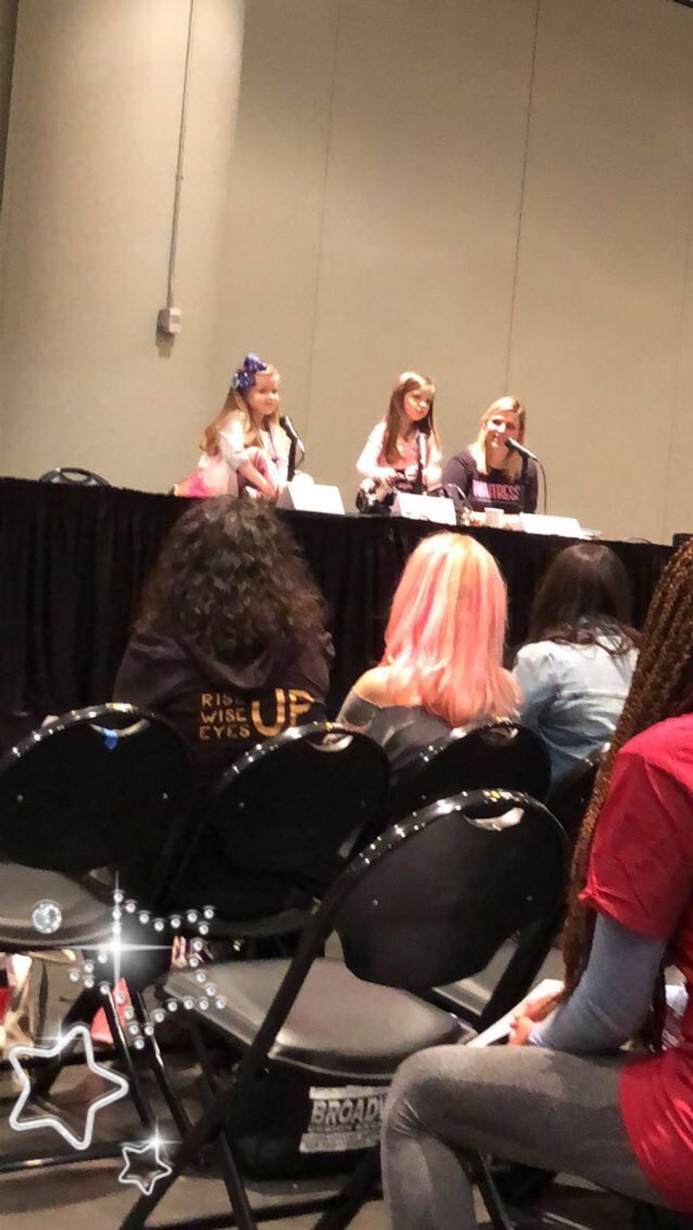 My sister and I love the show "Waitress", so after SpongeBob was over we went to a panel with two former little girls who had been in the show recently. BroadwayGirlNYC (a person who is known throughout social media for interviewing Broadway stars) was conducting a Q and A, so we listened in on that. The girls were so cute, and even sang for us! Afterwards, my sister took a picture with both of them, and I got their autographs!