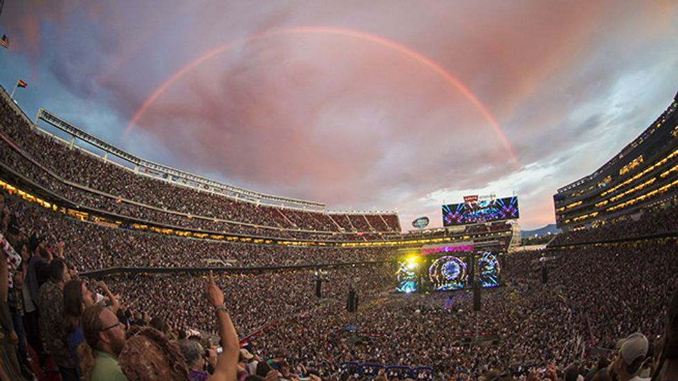 What happened the next five hours kind of blew my mind. Everyone there was the epitome of the stereotype of "hippie." There were tie-dye t-shirts of every color combination possible, dreadlocks that were miles long (you think I'm exaggerating, I'm not), and the smell of a certain something billowing throughout the stadium (you get what I mean, right? Colorado?). I even saw multiple mothers openly breastfeeding and there was not one person complaining about it (so different from Oklahoma, I couldn't believe my eyes!). Despite all this I've never felt at home as I did then. Every person was so completely accepting and carefree. They were all here to see the Grateful Dead, and nothing was going to bring them down. That was something I had to respect.