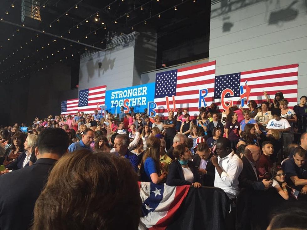 As soon as the invitation was initiated, I was instantly excited. My fan girl nature took over and the idea of going to something like that was honestly pretty exciting. So, the next day I woke up and trekked to my friends house and we were on our voyage by about 12 p.m. On the way there, I joked about my bound-to-be intimate interactions with Hillary, the potential crowd of 10 people, and demanding a selfie with her. We all laughed, knowing that a selfie was a shot in the dark and the only thing I would probably have a chance of seeing was tall people's heads and "stronger together" signs.