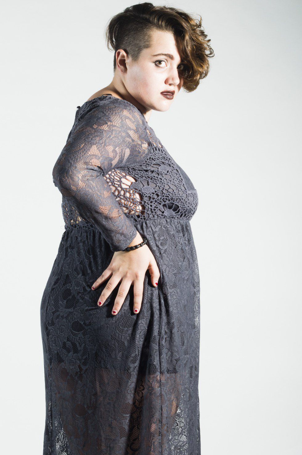 I changed behind the screen, clutching a grey dress with a sheer lace bodice. The bright lights illuminated the screen and the heat from the lamps caused me to break into a nervous sweat. At that moment I felt in touch with my 16-year-old self. The self-loathing I had worked so hard to usher out began to gnaw at me. I looked down at my body, and for the first time in months I felt hatred towards the many curves and shadows that I had moments before adored.