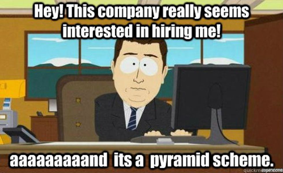 Day 1: I walk into the office with my hopes high, and money on my mind -- I was ready to kill it. I walk into the breakout room hoping that my boss is going to address me as a new manager in training, but all of a sudden something strange happened. I get placed within this group of people, some 40 years old, some 18 with peach fuzz. I figured that I was going to be separated amongst the group once the boss walked in -- think again. I then find out that I am starting at the same exact level as all of these cool cats hanging in the room -- I'm thinking what the hell is going on here? The group then breaks out in cult-like rituals by playing games, chanting, dancing, giving a ridiculous amount of high-fives, and praising their "national conference" like its the greatest thing on God's green earth. I figured I'd let it play out until I began my "management" duties.