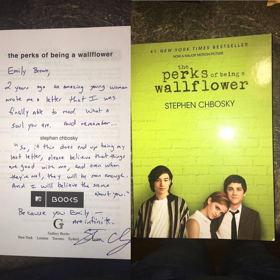 The package has a personal return address, from Mr. Chbosky himself. And when you open it up, inside you find a new, and different, copy of the book of you loved so much -- the book that changed your life. On the inside of the book there is a note, and it says, "Two years ago, an amazing young woman wrote me a letter that I was finally able to read. What a soul you are. And remember... 'So, if this does end up being my last letter, please believe that things are good with me, and even when they're not, they will be soon enough. And I will believe the same about you.' Because you — are infinite." It wasn't until you opened up the cover of that book, and saw what Mr. Chbosky had written, that you realized you were really alive — that you had made it.