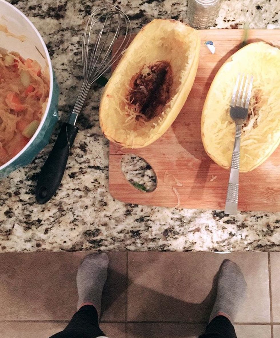 Begin by preheating the oven to 400 and cut the spaghetti squash. After scooping out the seeds, drizzle with oil and add a bit of salt and pepper. While that bakes in the oven for 40-45 minutes, mix ¼ cup of water, 3 tablespoons of soy sauce, 1 tablespoon of sesame oil, 2 tablespoons of honey, 2 tablespoons of lime juice, 2 tablespoons of sriracha, ½ cup of peanut butter, 1 ½ tablespoons of minced ginger, and 1 tablespoon of minced garlic in a bowl. Once the squash is complete, use a fork to pull out the spaghetti part of the squash. In a large bowl, mix the “spaghetti” with ½ large cucumber peeled and quartered, 1 cup of sliced carrots, 1 cup of diced bell pepper, ½ cup of chopped green onion, ½ cup of diced onion, and ¼ cup of chopped cilantro. Then, add the sauce. And finally, you may enjoy!