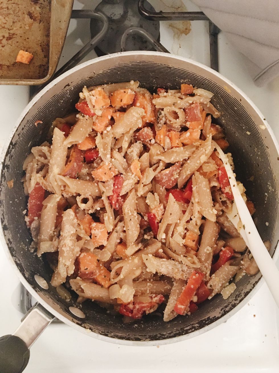 This is the most recent dish that I made and it was totally scrumptious. The recipe is very simple and only takes under an hour to make! Start by preheating the oven to 350. While that is heating up, chop up a sweet potato and 8 cherry tomatoes. After spraying those with cooking spray, bake for 20-25 minutes. Cook 2 cups of penne pasta and drain. Then, saute ½ of a large diced onion and ½ of a red pepper chopped. After sauteing for 5-8 minutes, add sliced mushrooms and saute for 5 more minutes. Once the pasta is complete and drained, add all of the cooked toppings and top with a bit of garlic powder, pepper, basil, and parmesan cheese. This dish is absolutely amazing for an easy, quick dinner, especially if you are in the mood for pasta that doesn't have the usual tomato sauce!