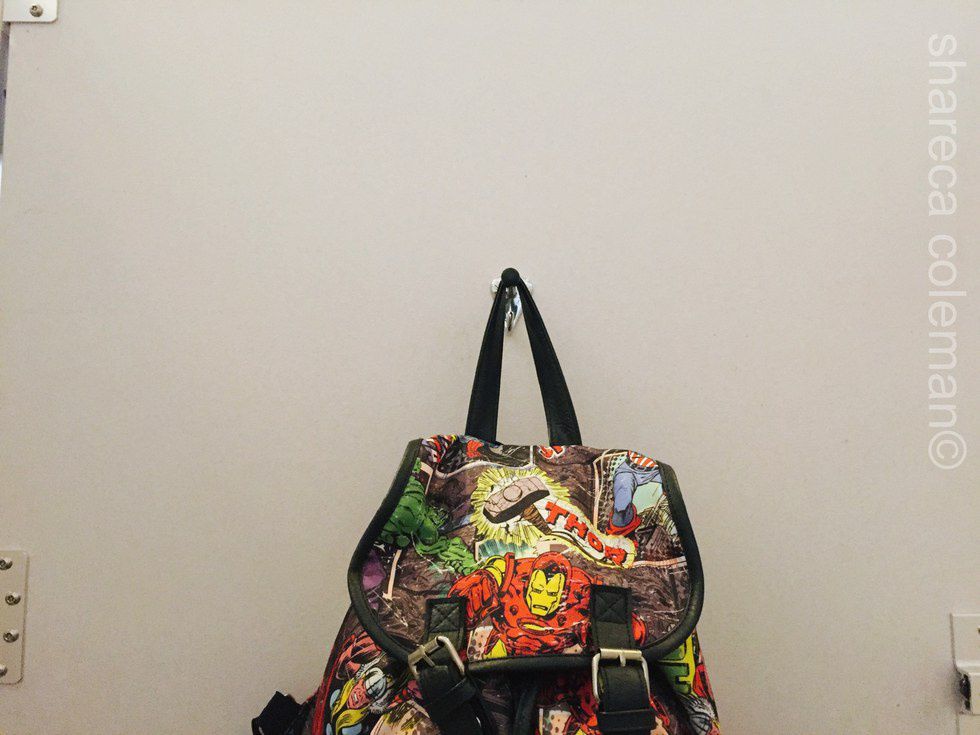 My Marvel backpack in it's prime, in a bathroom stall.