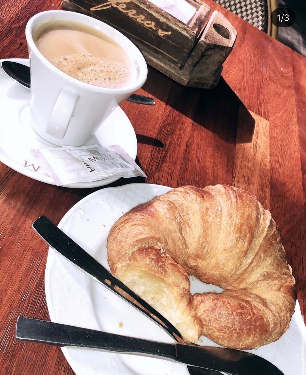 Below, see a golden-brown, flaky croisant with a cinnamon latte from my favorite cafe, Ferra's, in Madrid, Spain.