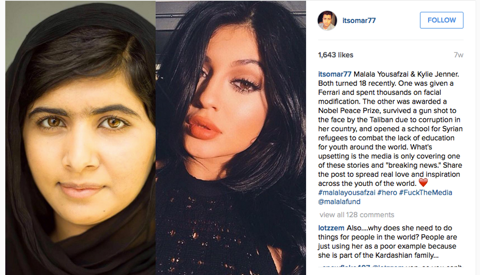 I think that everyone should look up to Malala. The issue of why we do not idolize people like Malala instead of actors or models was recently brought up on instagram. Omar Roque instagramed