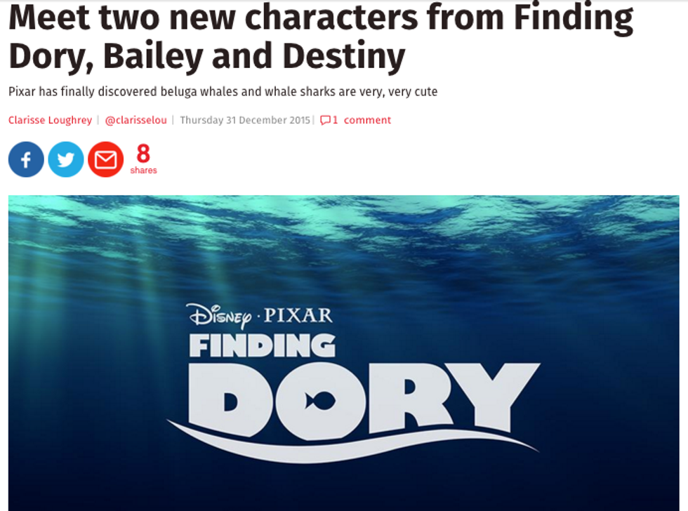 On the off chance this still isn't sinking in for you, let me clarify. If you'll just glance at my full name, under the title at the top of this article, you might notice that, in addition to my first name being "Dorie," my last name also happens to be "Bailey." Now, I invite you to take a peep at the image above once more. See what I'm saying? It is my destiny to be included in this franchise -- literally. What are the odds that my entire name will very likely be said multiple times on screen when this movie finally comes out? Can someone run the math on that? Oh, and just in case you were wondering, "Finding Dory" is set to be released June 17th, 2016. So, mark your calendars, because that's the day I leave the country, change my name, and leave this entire franchise business behind.