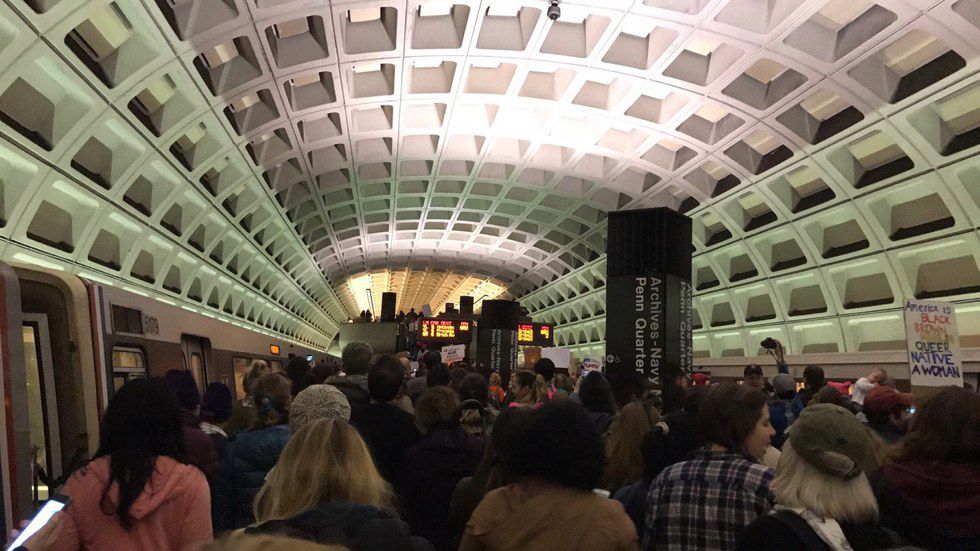 I had left the place of residence that I spent the night at with two of my sorority sisters at approximately 9 A.M. in order to get to the march around 10 A.M. When we had approached the subway station we realized that the it was going to be a lot harder to try to squeeze onto the metro then expected. My party and I watched a whole train completely packed ride right by us heading south towards Lafayette Plaza. People were traveling in groups all decked out in pink hats and signs.