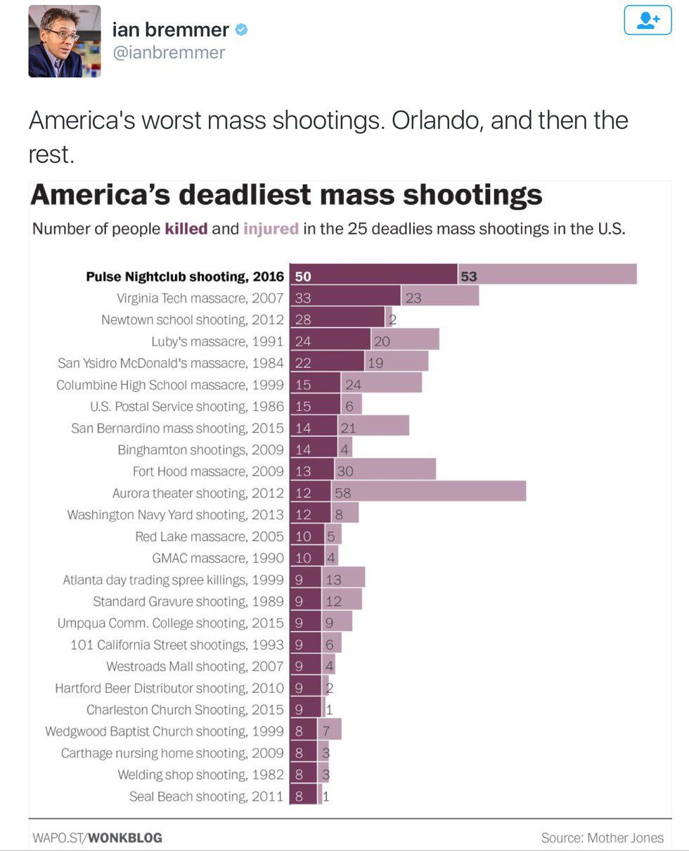 According to a tweet by NYU Professor and Political Scientist, Ian Bremmer, there have been 15 mass shootings with 238 killed and 476 injured since 2000. Keep in mind that this data does account for other domestic/international terrorist attacks and mass shootings abroad. But, this statistic speaks volumes about the amount of hatred there is on planet Earth right now. It needs to stop before it conquers the world.