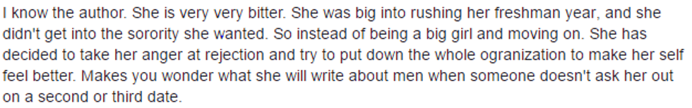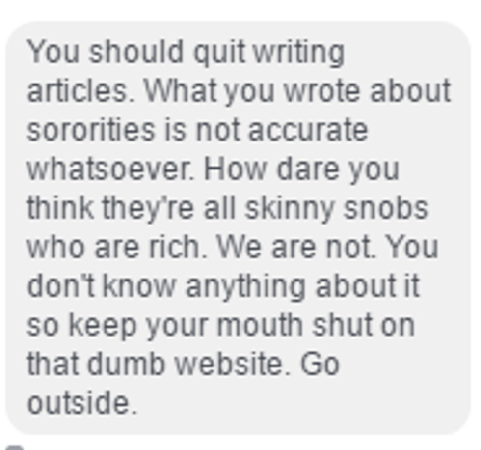But I guess, in the end, it's good for all of you to see the kind of impression you're putting off. It's good to see how you're affecting high school seniors who are trying to decide whether or not to rush. And for the girls who read my article, in hopes to find some guidance, they read all of your mean comments and hopefully decided not to be a part of a belittling environment.
