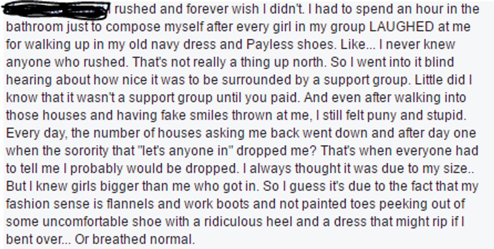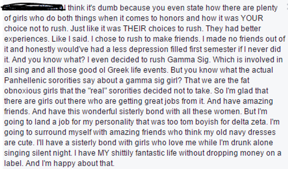 I hope you're glad you rushed. I hope your sisters are the greatest thing since sliced bread. But for me, I want to stay out of Greek life altogether. The comments, Facebook messages, voicemails, middle-of-the-night phone calls, and text messages just confirmed my decision to not be a part of an organization that values degrading those with differing opinions.
