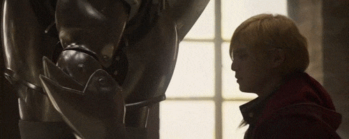 There they are: the Elric brothers, in the flesh and armor. I'm still in shock that I'm typing this. There was a voice over, of Edward, saying "I promise I will get our bodies back." I somehow knew that they wouldn't show Alphonse completely, and from what I see, it looks scarily accurate. The brief movement was so fluid, so human-like, and it looked so real. Then Edward just walks up and rests his forehead on his brother's chest, and WB Japan might as well stab my own chest.