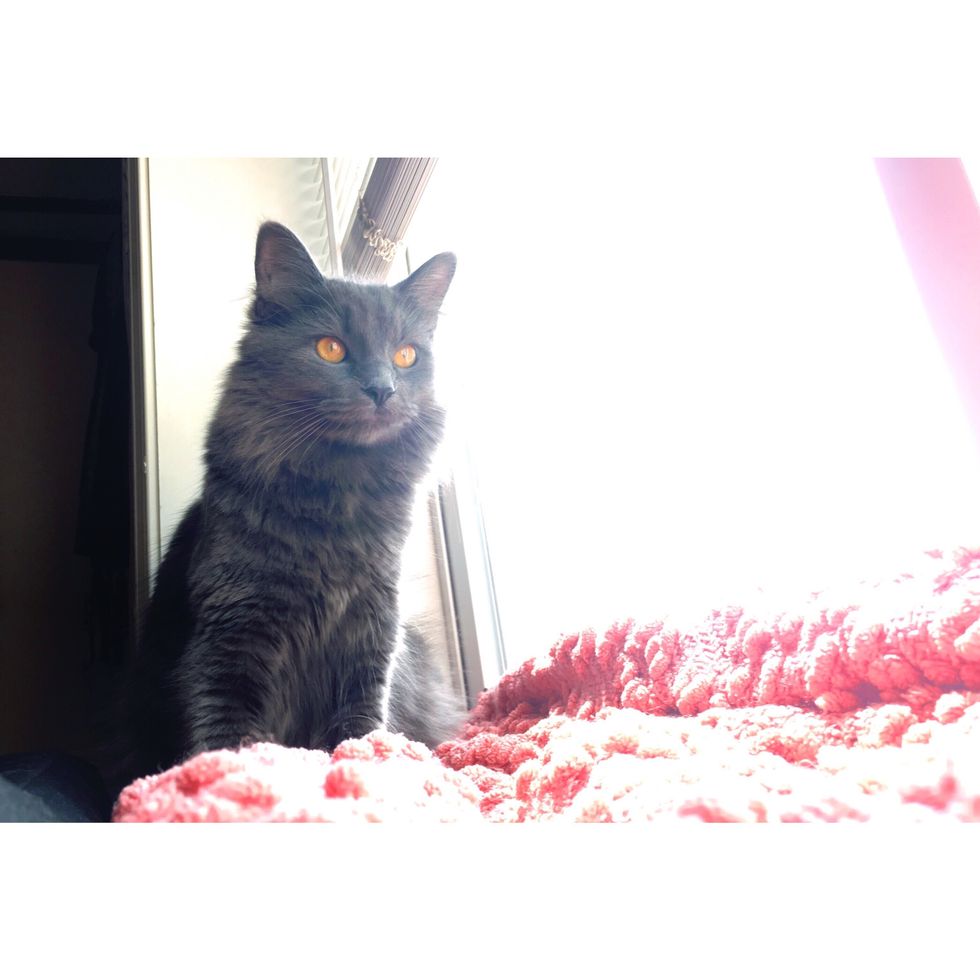 She was the fuzziest mess of a thing I had ever seen. Just a gray tuft of fur with whiskers, ears, bean toes, and the brightest yellow eyes. She was able to loaf in the palm of my hand. That night, I was terrified that I would roll over in bed and crush her! She has grown up a lot since then; her mane is sleek and shiny, her tail stands high and proud. She is a very skilled hunter, tracking down beetles and flies like a ninja.