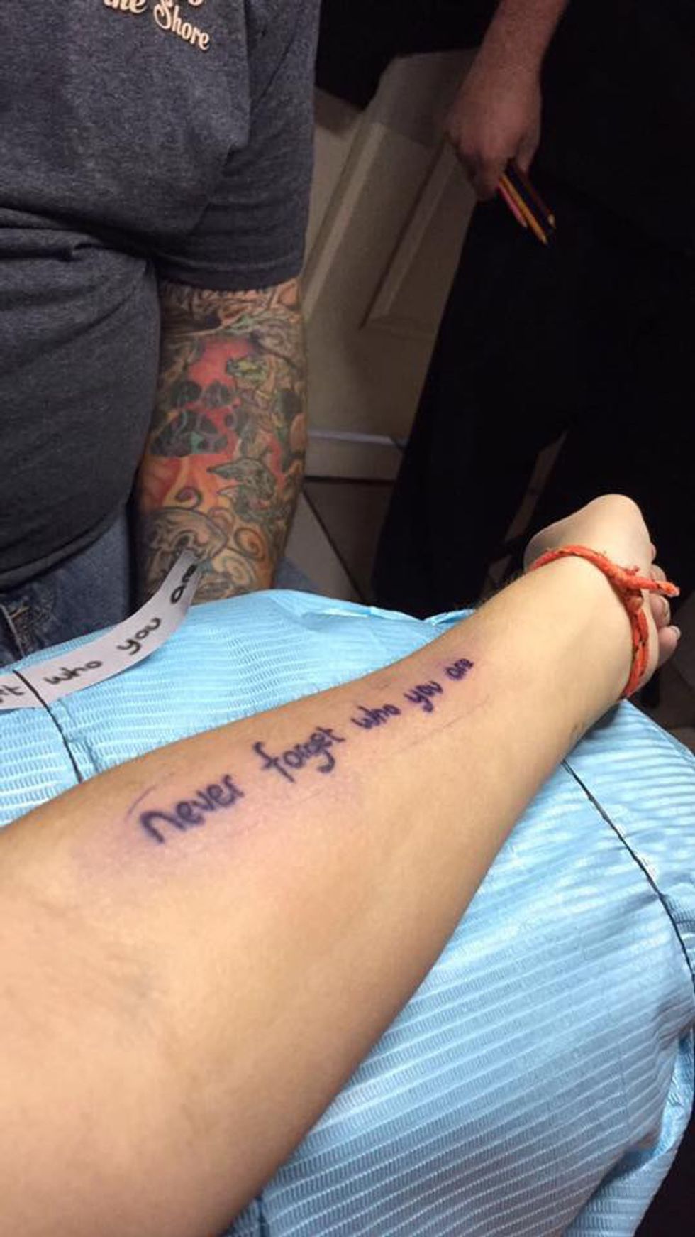 It's on my left forearm and it says, never forget who you are.