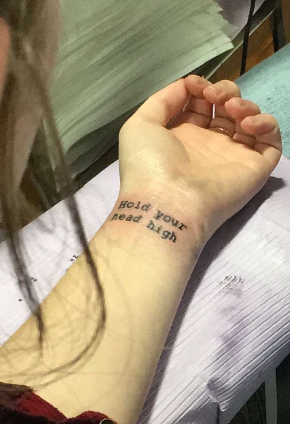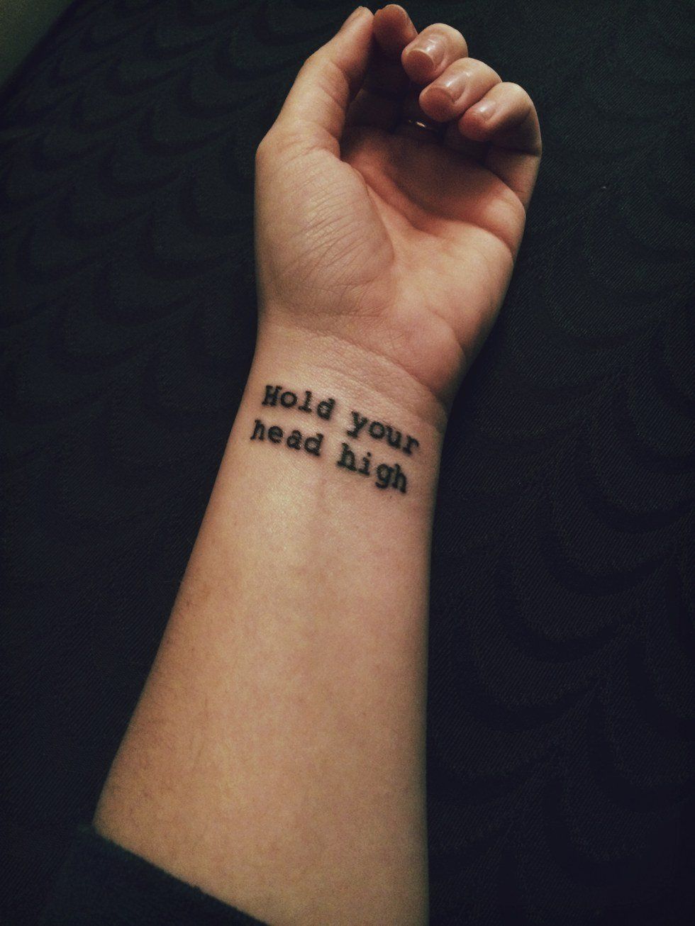 My tattoo is the first part of my great-grandfather's advice to me before I went away to college, "Hold your head high." I had this tattoo done while I was at college, in Kentucky, and my parents were in Pennsylvania. I called them up on the Saturday before President's Day, on that Monday, and told them I was getting the tattoo. Now my dad's response was "You go girl!" but my mom was not as thrilled. She tried to have my dad convince me into waiting until I went home to get it done, but this was something that I prayerfully considered for a few months and it felt like the right time, especially since that Friday night we almost lost my Poppop. So, that Monday morning my friends and I all piled in a car (because that's what you do when the least likely person in your friend group to get a tattoo is getting a tattoo) and we went to Cracker Barrel for breakfast, and headed over to the tattoo parlor. While I wasn't able to get my tattoo done that particular morning, I made an appointment and had it done that afternoon. I walked out of that parlor with a huge smile and a permanent mark on my wrist to remind me everyday of the words my Poppop spoke to me.