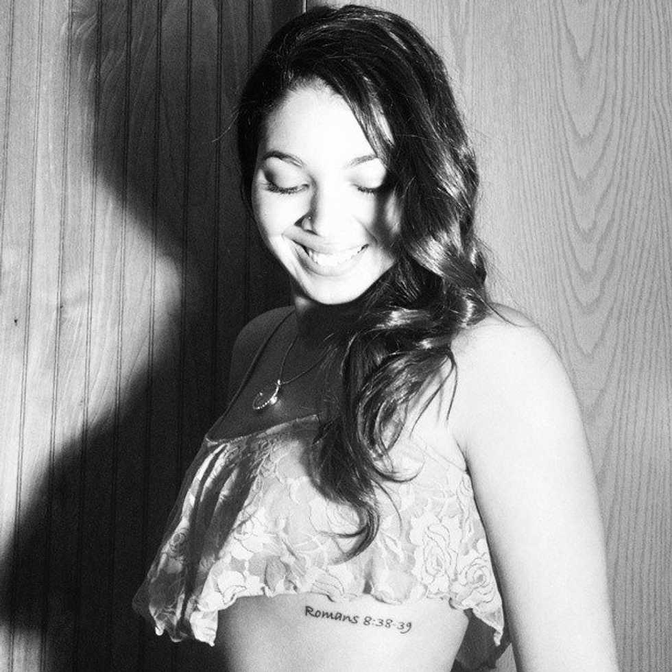 I'm not sure when I first read Romans 8:38-39, but it has been one of the most influential verses in my life. It reads, "And I am convinced that nothing can ever separate us from God's love. Neither death nor life, neither angels not demons, neither our fears for today nor our worries about tomorrow--not even the powers of hell can separate us from God's love. No power in the sky above or in the earth below--indeed nothing in all creation will be able to separate us from the love of God that is revealed in Christ Jesus our Lord." I memorized and meditated on these words for an entire year before deciding that I wanted them to be a permanent marking on my body. This tattoo serves as a reminder that, like a tattoo, God will never leave me. He loves me immensely, and there is nothing that can separate us from one another. How awesome is that?