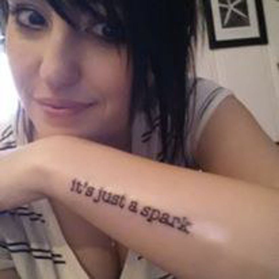 There are many reasons why I decided to get this tattoo. This song means way too much to me, just as the band does. I used to self harm and have been free from it for 5 yrs. It will be 6 in December 2016. I got it to represent To Write Love On Her Arms, Paramore, and those who were there for me in my darkest times. Those things were my "spark" or my light so to speak. " it's just a spark, but it's enough to keep me going. And when it's dark out, no one's around. It keeps glowing."