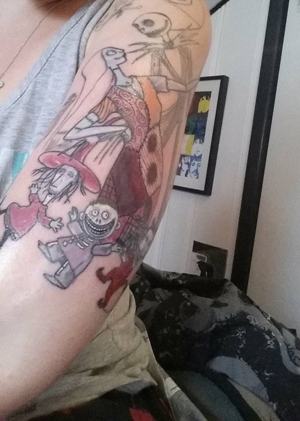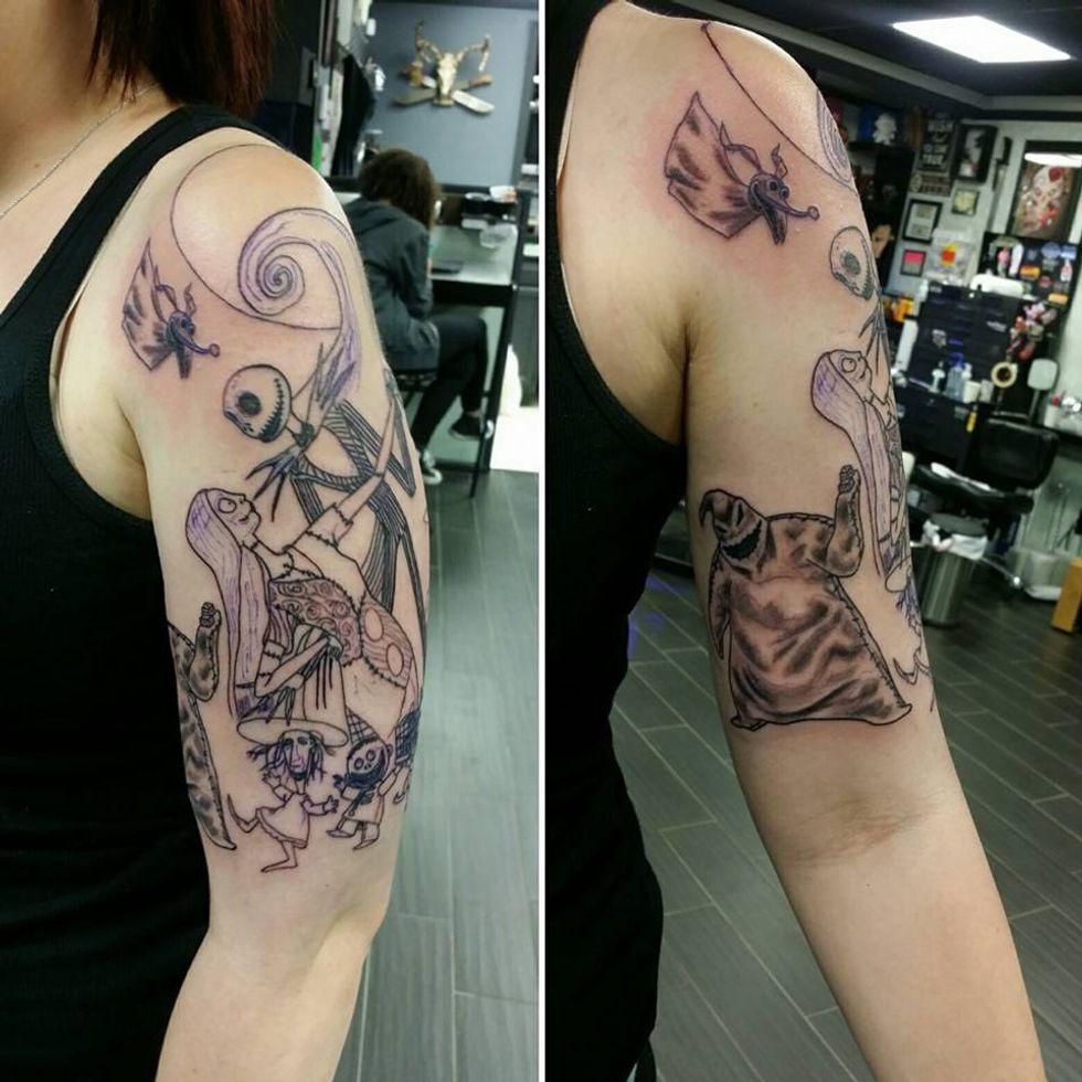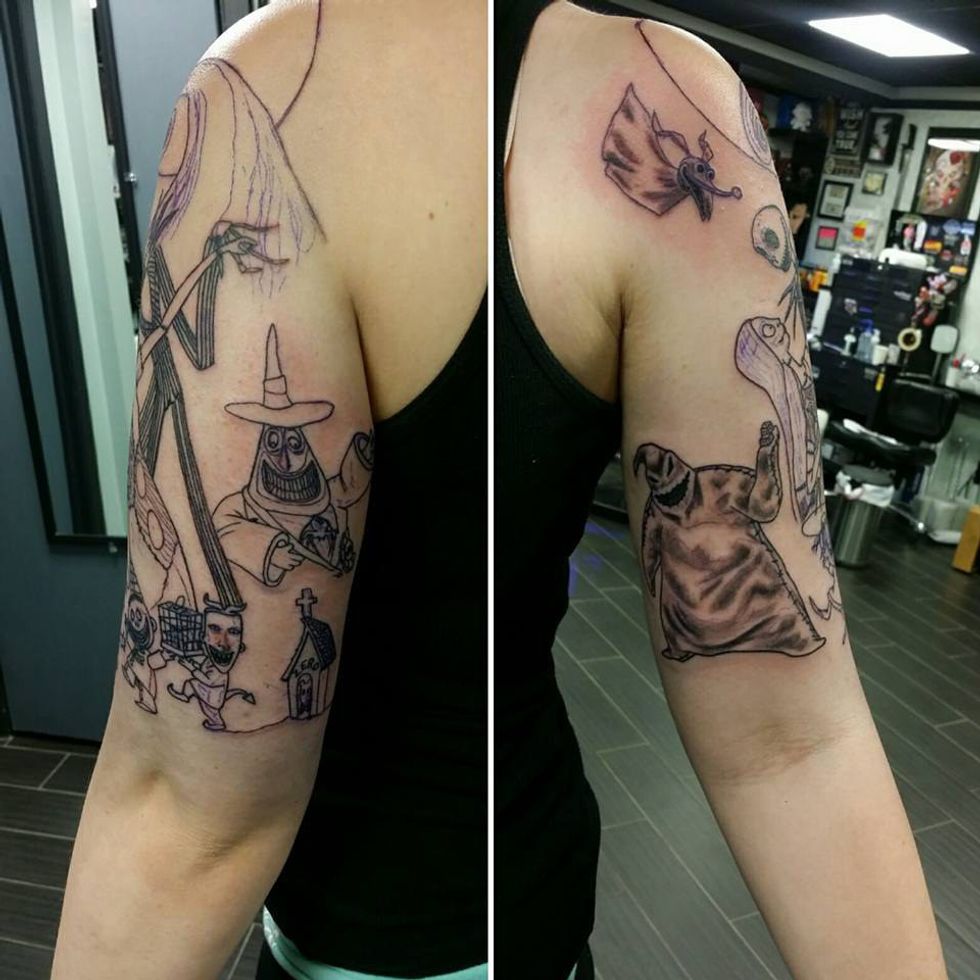 This Tim Burton piece was originally going to be our father lord of darkness...I mean Edgar Allan Poe. I originally had gone to the shop and dropped off a deposit for the Poe inspired tattoo. About two week before my appointment my mother said "You should get something to do with the Nightmare Before Christmas instead." So, while browsing online I found this incredible half-sleeve. I decided to show my mother and she somehow agreed to it. I'm going for a third session soon and I have a fourth coming up just before Halloween. I am so happy about this piece and I proudly wear it where ever I go. Brian at Rorschach Gallery is an amazing artist. Long story short we found out a relative of his actually works with my father..who would have known?