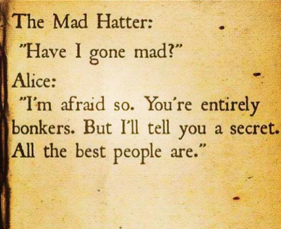 I love this quote from "Alice in Wonderland." It gives off a sense of childlike whimsical fun while being totally serious at the same time. It makes me feel like I fit in and that all the crazy people in the world are what make this world great.