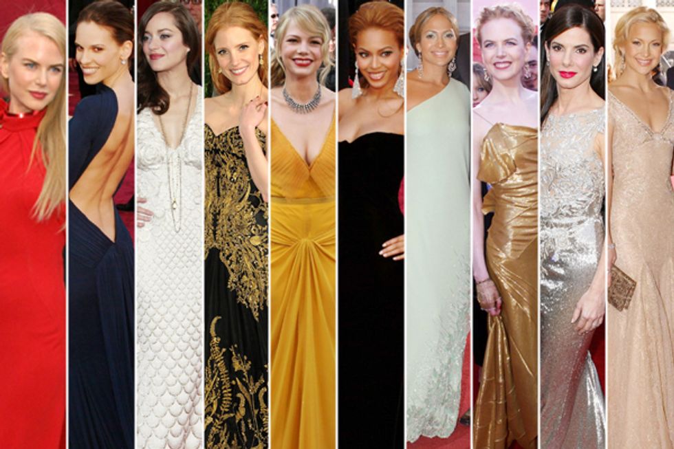 Though many argued Jennifer Lawrence's fiery red Calvin Klein dress was boring and tasteless, it happens to be one of my favorite Oscar looks of all time. Her dress is from the Calvin Klein Collection, made for her by designer Francisco Costa. Though not pictured, her "New Lancer" platform sandals are Jimmy Choo, and she finished the outfit with Chopard jewelry, and a Judith Lieber bag.3. Angelina Jolie at the 2012 Academy Awards