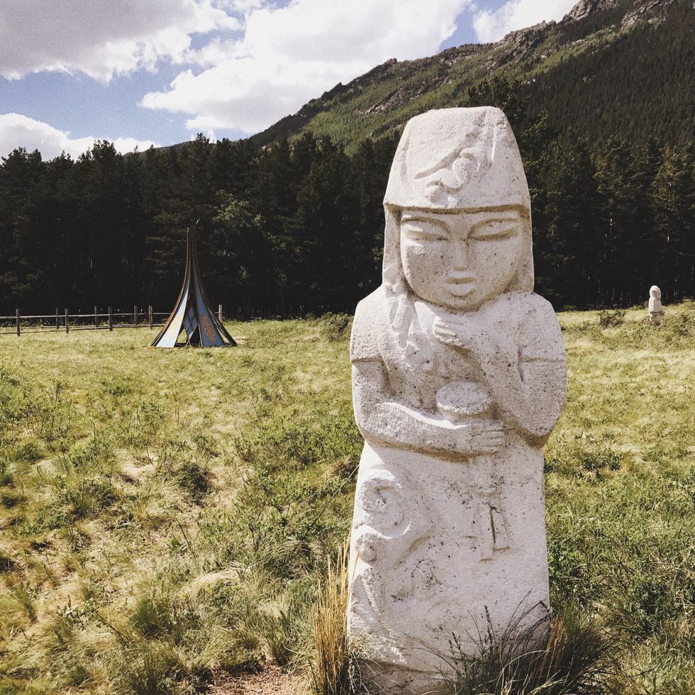 Literally the name of the stone means "a mysterious stone" from Kazakh language. If you look at it from one side - you see a girl with hair flying in the wind, on the other - it's a boat, perhaps the one built by the singer's hands.