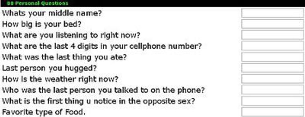 The best answer to "Who did you last hug/kiss" was always "Him. C:" That way you knew your friends would ask about it later and you'd supply them with juicy gossip.