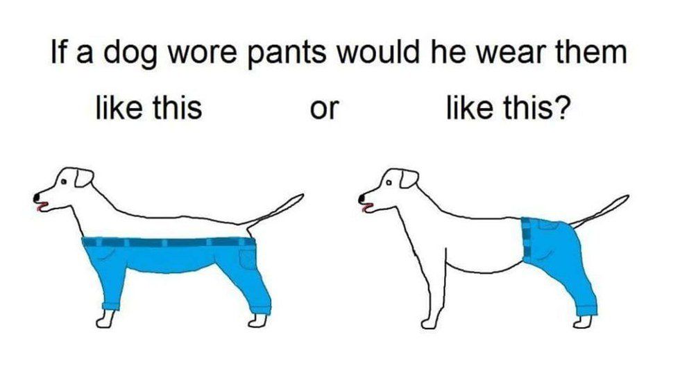 First ,however, let us address the problems with the two models of how a dog should wear pants that the picture presents. The dog on the left obviously has all of his legs covered but his posterior is shamefully exposed, whereas the dog on the right has a more presentable bottom in exchange for allowing two of its legs to be uncovered. I will concede that the dog on the right looks more aesthetically pleasing in the fashion it wears its pants, but are aesthetics the only thing that matters when we consider whether something is right or not? Surely not. Therefore let us discuss how we can determine which form of pants is better.