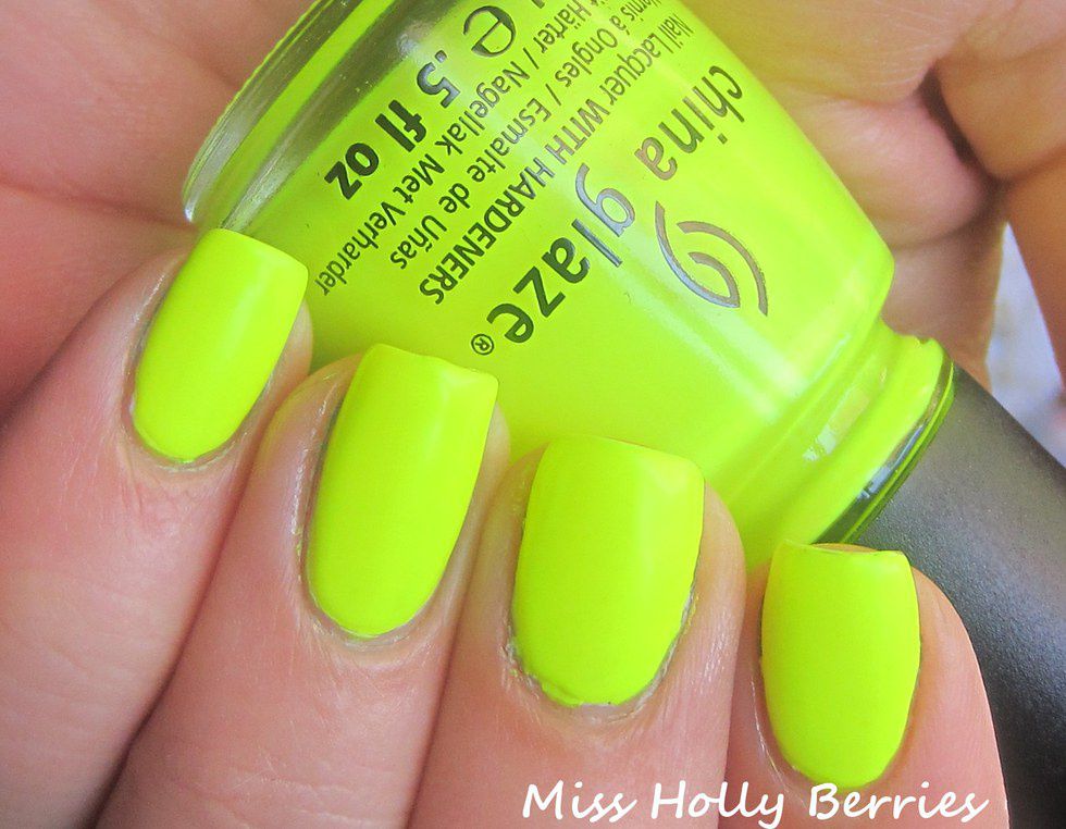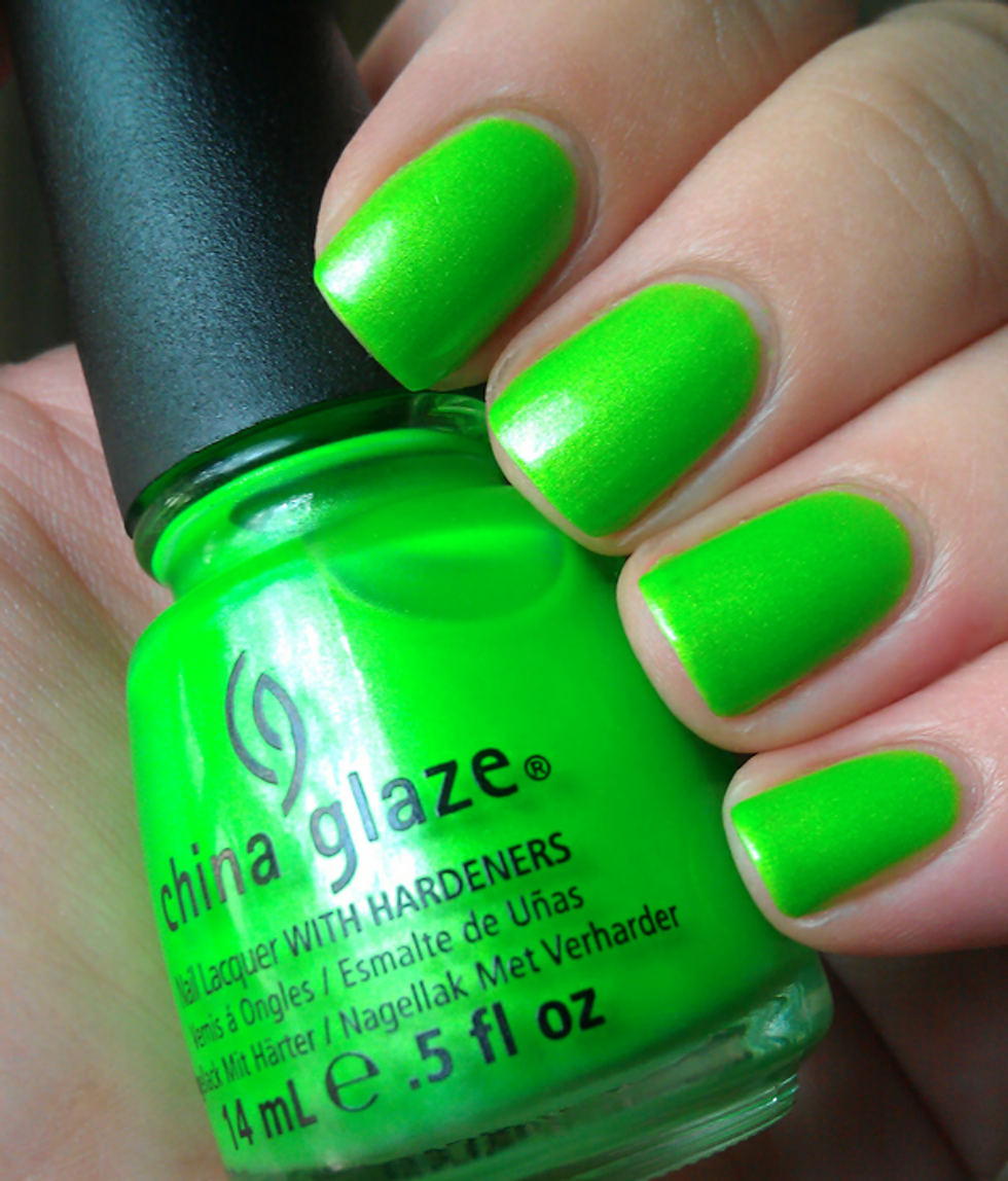This is Celtic Sun by China Glaze and another shade that is neon. I commonly refer this color to people as 'highlighter yellow.' I highly recommend applying at least three coats of this color to your nails because I believe that it is too dull of a color with just two coats. However, you could always add the white base before painting your nails this color, then only two coats at most would be necessary.