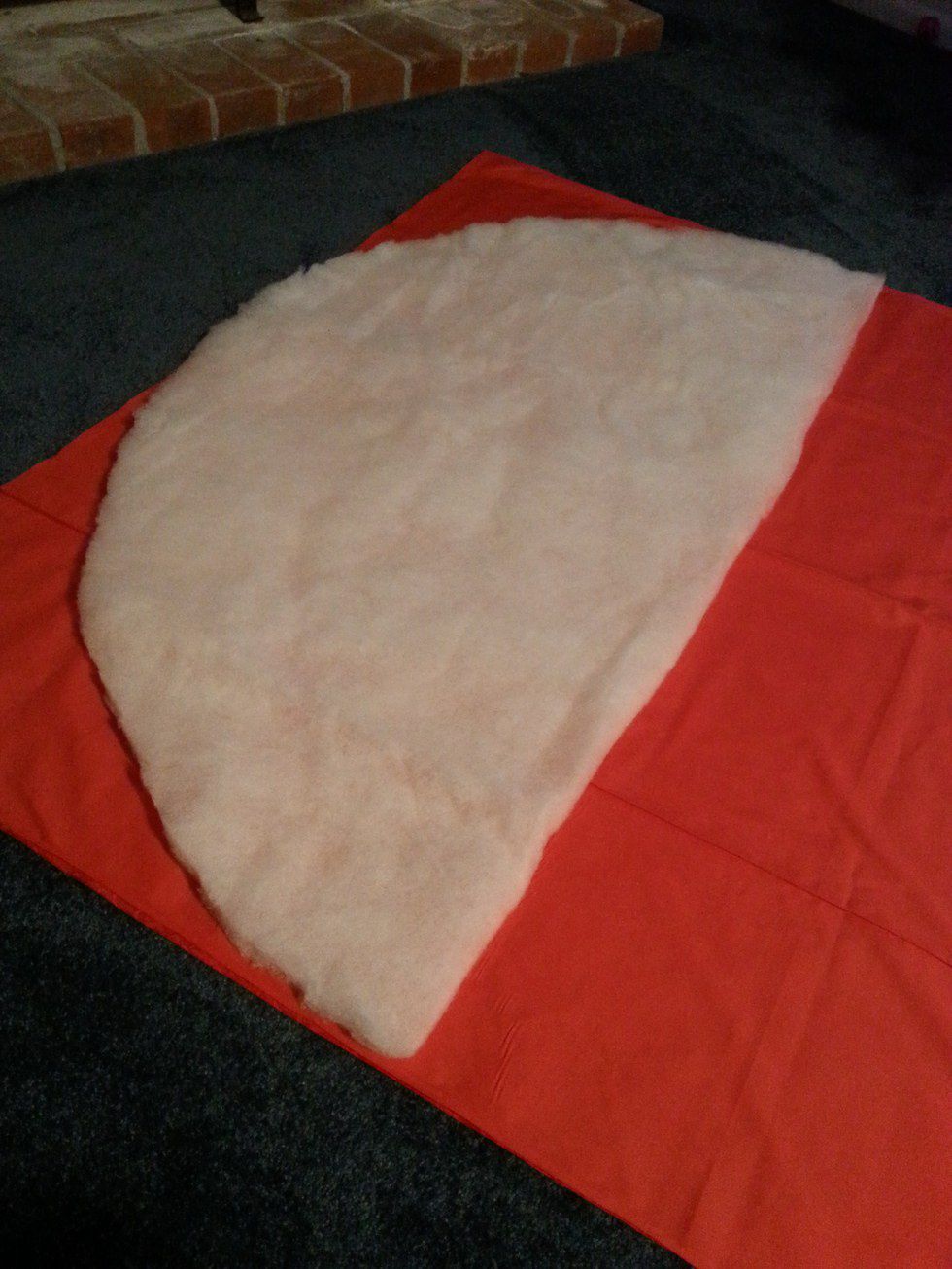 2. Trim your polyester tree skirt until It fits the 1 1/4 yard size of your fabric (Hint: Fold the circle in half, then fold that half circle in half. Fold that quarter once more so it looks like a slice of pizza. Following the shape of the curve that the polyester already has, trim the "pizza crust" off until you get a good fit.)