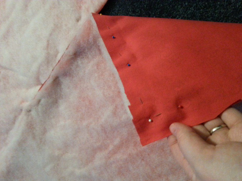 5. Pin these three layers together, using however many pins you need (Hint: I put my pins in so that the back of the Display Side was facing up, which is how I wanted to have it while sewing on the machine for easy removal. Also, as you start step 6, make sure you take your pins out as you go.)