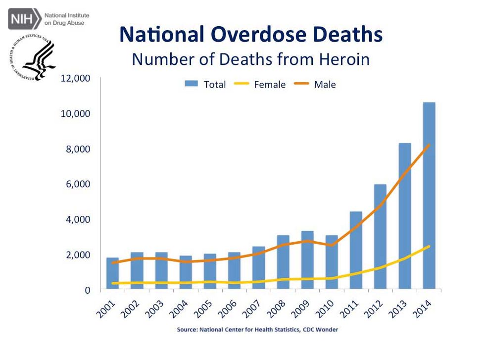 As clearly represented in the chart above, over the years heroin use has seen a large increase in the U.S. When a person is overdosing on an opioid such as heroin, morphine, codeine, oxycodone, methadone or Vicodin, the drug has attached to the opiate receptors within the user’s brain and begun to affect their ability to breath and remain conscious. Naloxone, specifically the well-known brand Narcan, essentially removes and knocks the opioids away from/ off of the opiate receptors of the brain.[2] Taking around an average of 5 minutes to start working, Narcan reverses an overdose, resetting the person's breathing, and allows the user to live. As reported by medical professionals,