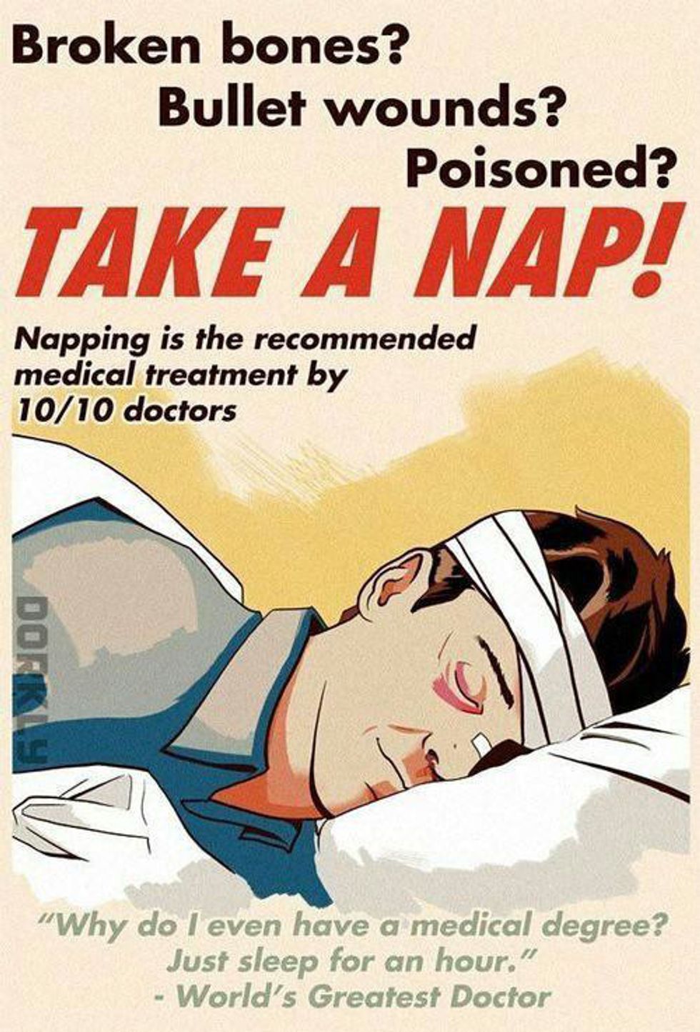 A nap a day keeps the doctor away. A nap is a much better energy boost than any energy drink or coffee boost you could ever get, plus a nap can help your body fight off illness, weight gain, and much more. (my own opinions - not entirely scientifically based)