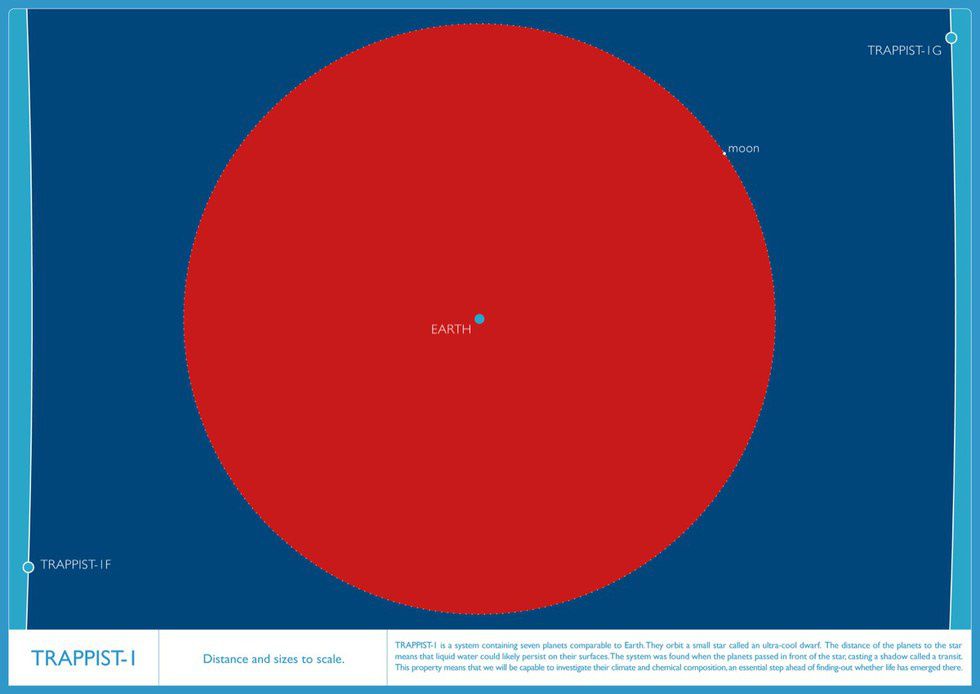 All seven of the TRAPPIST-1 exoplanets are closer to their star than Mercury is to our sun. These planets are also nearby to the other, if a person was standing on one of the planet’s surface, they could gaze up and potentially see geological features or clouds of neighboring worlds, which would sometimes appear larger than the moon in Earth's sky.