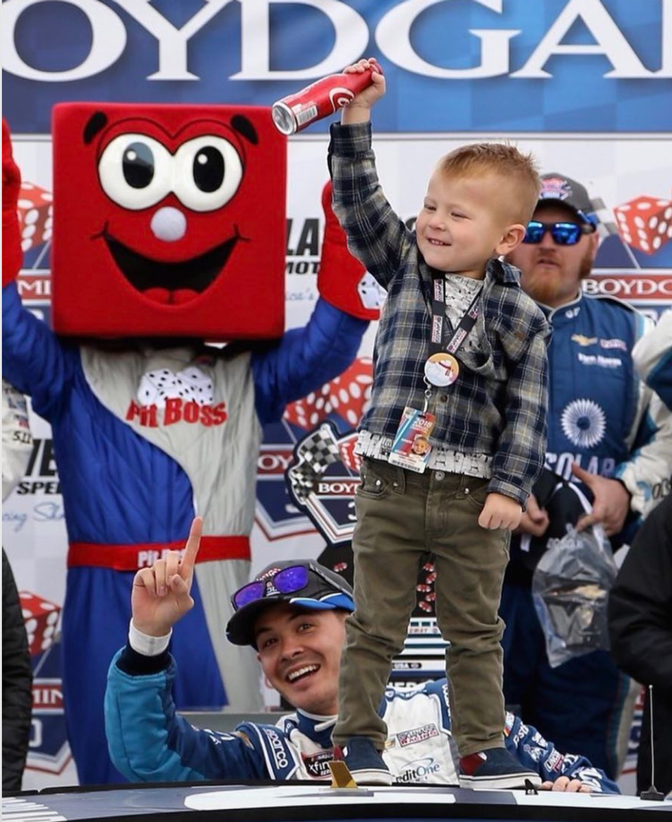 Kyle had a heck of a run last season in the Chase but ended up getting eliminated in the middle due to blown engines and wrecks. What doesn’t kill you makes you stronger, right? Keep your eye on Kyle. With his dirt background, he has a great hold on the new Chevy Camaro, best in the field. And I mean, we need lots more of these adorable pictures of Kyle and his son!