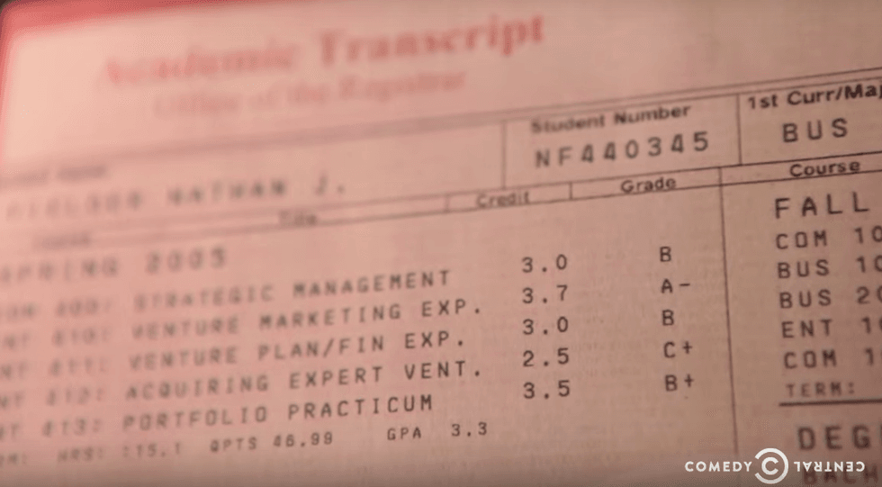 Like Gordon Ramsay’s “Kitchen Nightmares,” where the host is prompted with the task of saving a local restaurant by making changes to their base strategy, Nathan Fielder’s “Nathan For You” operates on small businesses. However, the events are almost all completely fictional and extremely entertaining. He says in the introduction that he “graduated from one of Canada’s top business schools with really good grades.” Here is his transcript: