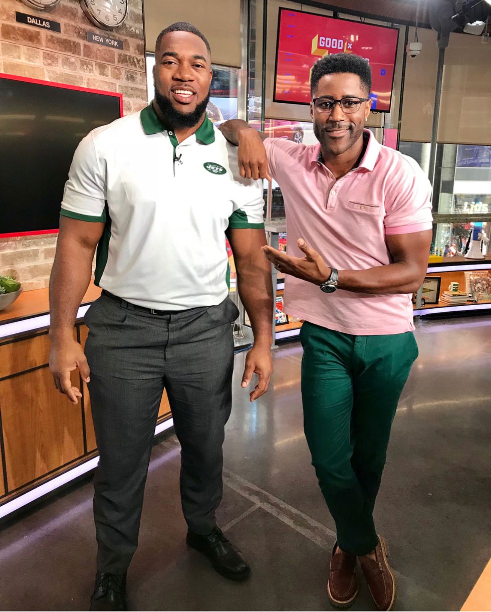 He soon got a job as a bouncer at a nightclub in Ontario where he would continue to work hard, and one night the boss said there was big guest coming in. That guest was Former NFL WR and current analyst Nate Burleson. Although it doesn’t sound like that big of a deal, he was the first NFL player shepherd had ever met, and it stuck with him. Shepherd could remember almost every detail of that encounter, and he was able to tell the story on Good Morning Football alongside Nate Burleson who is also from Canada and was a 3rd round pick in the 2003 draft. He said that Nate told him to stick with his dream and gave him a $100 bill as a pre singing bonus.